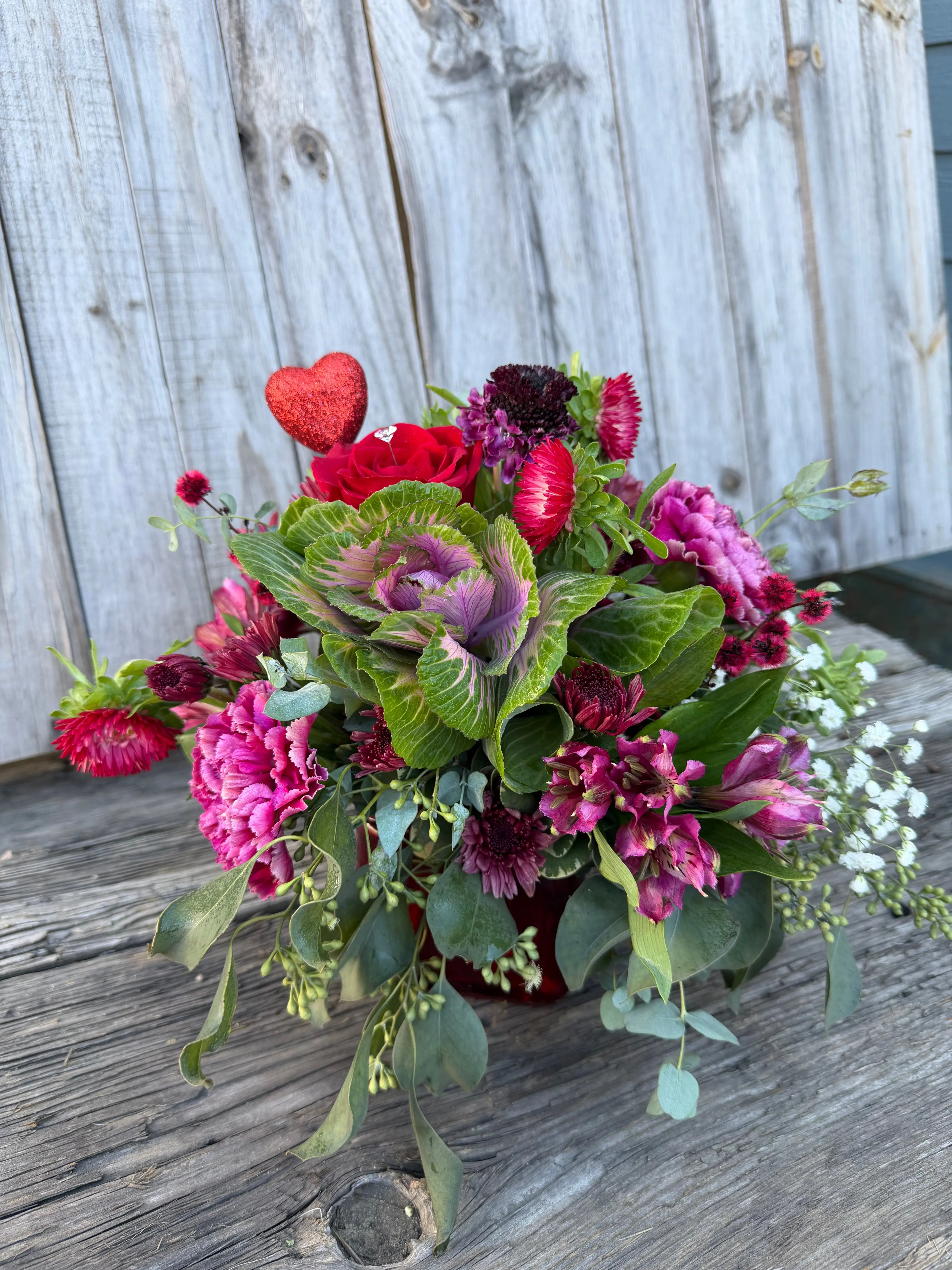 A mix of purple red and pink flowers. Actual flowers and colors may vary.